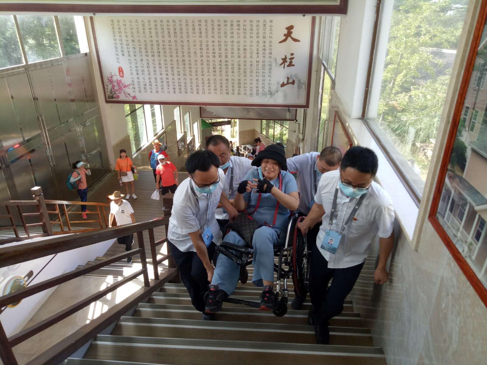 “天柱山很美,景区服务很周到,为索道工作人员的贴心服务点赞”。8月16日,天柱山风景区迎来了一批特殊的游客,为了让这批残疾人士一睹天柱山的美丽风景,大龙窝索道和执法大队一中队及时抽调党员骨干,组成10余人的爱心志愿者分队,全程陪同一对一的为他们贴心服务,志愿者们采取了背、抱、扶的办法,为残疾人士实现了无障碍通行,检票口开通了绿色检票通道,站台服务细致入微,使得这批特殊的游客感受到了来自景区的温暖,圆了他们的登山梦,大龙窝索道正在用实际行动践行着“大爱天柱,情系天下”的服务宗旨。(文图/李平)