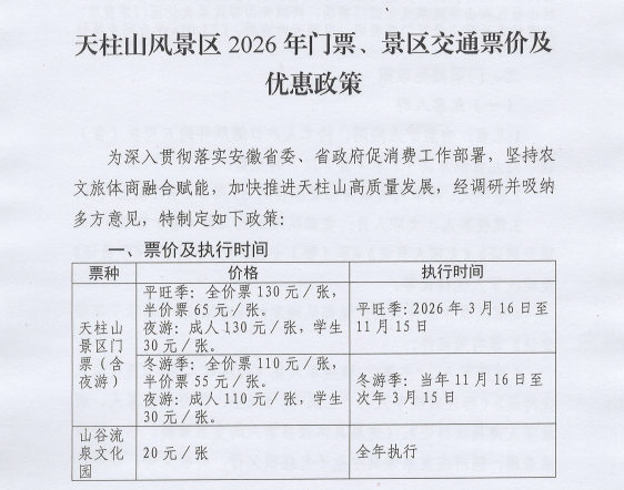 天柱山风景区2026年门票、景区交通票价及优惠政策