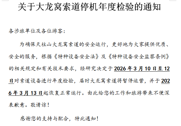 关于大龙窝索道停机年度检验的通知