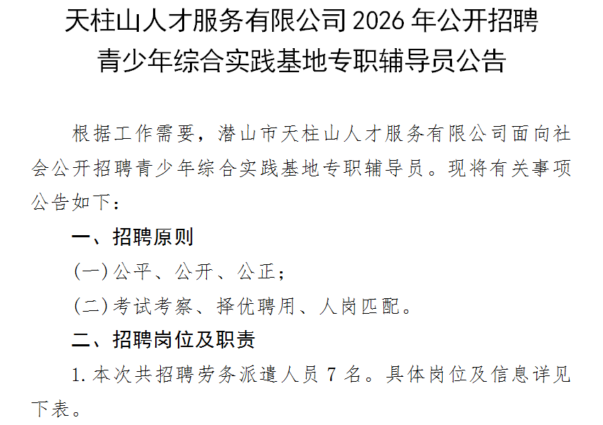 根据工作需要,潜山市天柱山人才服务有限公司面向社会公开招聘青少年综合实践基地专职辅导员。现将有关事项公告如下:一、招聘原则(一)公平、公开、公正;(二)考试考察、择优聘用、人岗匹配。二、招聘岗位及职责1.本次共招聘劳务派遣人员7名。具体岗位及信...