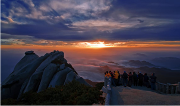 特色: 朗朗乾坤,绮霞纷祥;山清水秀,艳阳高照。当清晨的第一抹阳光穿透薄薄的云雾,刺射晨初的水露散射在万丈高空,山下仰望,那是山与光的相互依托,一映一景,尽态极妍,极显天柱峰光。晨阳渐升,松云环腰,时轻时浓,满山苍翠若隐若现,每至峰顶散阳透入,则如金环系腰,风云变幻,尽展天柱奇祥。及至正午,拨云见日,南山当户转分明。屹立天柱之巅,城中景尽收眼底。更甚则是六月清和雨...
