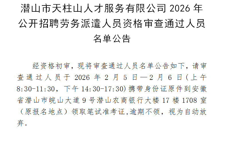 经资格初审,现将审查通过人员名单公告如下,请审查通过人员于2026年2月5日—2月6日(上午8:30-11:30,下午14:30-17:30)携带身份证原件到安徽省潜山市皖山大道9号潜山农商银行大楼17楼1708室(原报名地点)领取笔试准考证,逾期不领,视为自动放弃。 附...